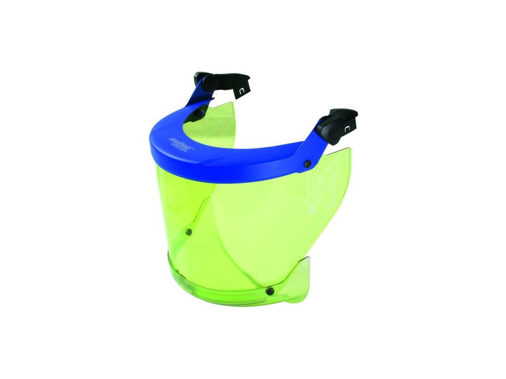 Arc-fault-tested face shield with clip and transparent chin protector