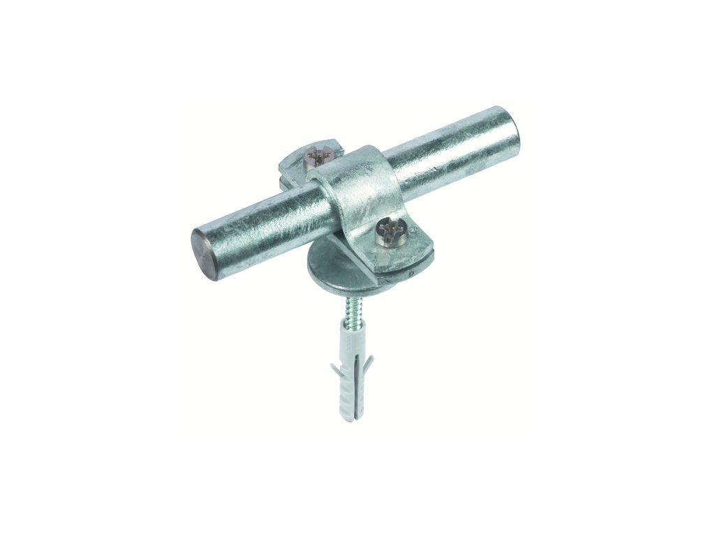 Rod holder with slotted saddle clamp and flange, for fixing air-termination and earth entry rods Rd 16 mm, fixed conductor routing, pre-assembled with screw and plug.Zusätzliche Parameter